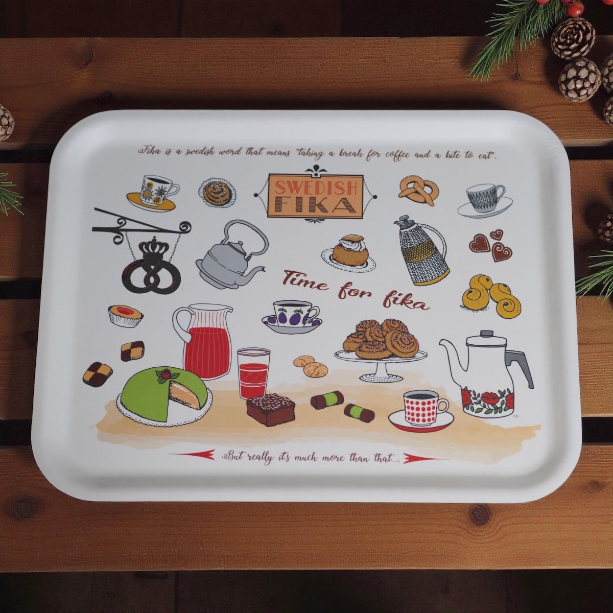 本品には、いろいろなモチーフが描かれています。ヴィンテージ食器に注がれた紅茶やシナモンロール、プリンセストルタ(ケーキ)、サフト(ジュース)、ルッセカット(スウェーデン風サフランパン)などなど…。36cm × 28cmと大きいサイズなので、ポットもカップもお菓子もまとめて運べます。木の合板でできているので、ナチュラルな手触りも特徴。